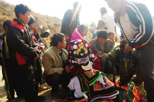 彝族人接親,是通過“搶”的方式進(jìn)行的。接親者想早點(diǎn)兒背著新娘上婆家,而新娘的姐妹們則想讓新娘多留一會(huì)兒。當(dāng)接親者來搶新娘時(shí),圍在新娘身邊的姑娘們,把煙灰抹在手掌上,或拉著、或抱著、或追著去抹接親的人,那些接親者便一個(gè)個(gè)成為“黑花臉”,讓周圍的人們見了哄堂大笑。