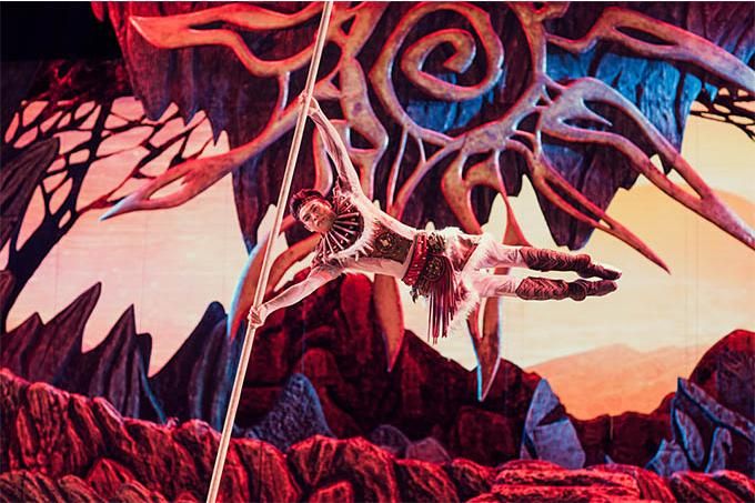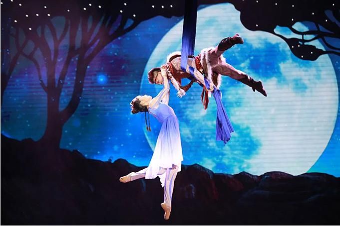 雜技藝術在劇場空間維度的呈現(xiàn),一是把身體作為一種最為本質的符號材料進行直接表現(xiàn);二是通過與物體、音樂、舞蹈、燈光、唱詩等的排列組合,展示技藝的身體與物體、空間的關系,達到彰顯其生命意蘊與美學品質的目的。劇中網吊、綢吊、轉動桿上技巧等項目非常炫技,展現(xiàn)了現(xiàn)代雜技的審美意境,詩與思在舞臺上相得益彰。綢吊極具浪漫色彩,承載著輪回與終極的生命哲理;智者的“唱詩”,凸顯了該劇的史詩特征,增加地域文化和遠古歷史的厚重感。