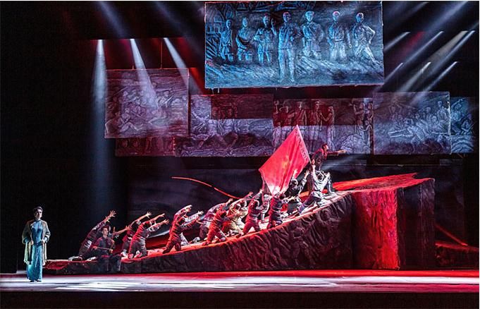 在舞蹈語言的設(shè)計上,編導(dǎo)融入當(dāng)代元素,使觀眾不但感受到審美的親切與現(xiàn)代感,而且還自然地進(jìn)入回望歷史的情境,對其思想內(nèi)涵的理解更為準(zhǔn)確。該劇的道具使用和調(diào)度也頗為大氣,令人印象深刻。一組斜坡狀的大型舞臺道具不但由群眾演員直接移動而實(shí)現(xiàn)即時的場景調(diào)度,還可使演員上下和左右而行,最終組合成巨大的中國共產(chǎn)黨黨徽,輔助完成了人民英靈和英雄的形象塑造。