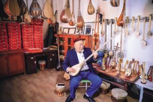 民族樂(lè)器制作技藝(維吾爾族樂(lè)器制作技藝)國(guó)家級(jí)傳承人艾依提·依明在家中樂(lè)器陳列室演奏民族樂(lè)器。新華社記者 張曼攝