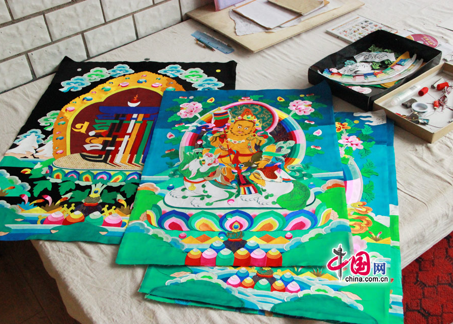 堆繡的工序一般有圖案設(shè)計(jì)、剪裁、堆貼、繡制,個(gè)別圖案部分上色等。堆繡先按規(guī)范的佛畫繪成畫稿,再按佛像不同部位的要求選用各色面料,剪貼縫制而成。小幅畫面為一尊主佛像與下方兩尊小佛像組成,周圍配以花卉、云紋、日月、供品等圖案。與傳統(tǒng)的唐卡不同,堆繡工藝品是用各色棉布、綢、緞剪成所設(shè)計(jì)的各種圖案形狀,精心堆貼成一個(gè)完整的畫面。其工序有圖案設(shè)計(jì)、剪裁、堆貼及個(gè)別圖案部分上色等。一般來講,圖案設(shè)計(jì)環(huán)節(jié)主要以客人需求為主。勾草圖最能考量藝人繪畫技能,也是至關(guān)重要的步驟。圖案設(shè)計(jì)完成后,將各色布料比照?qǐng)D案剪裁、粘好,之后再填充以羊毛或棉花等,以使圖案凸起,最后將各色布料圖案堆貼在設(shè)計(jì)好的大幅布幔上,構(gòu)成一組完整的畫面,達(dá)到靜中有動(dòng)、生動(dòng)傳神、惟妙惟肖的境地。使畫面產(chǎn)生豐富生動(dòng)的立體感和織物特有的肌理感,達(dá)到淺浮雕式的藝術(shù)效果,表現(xiàn)力豐富。作品粗獷中顯細(xì)膩,點(diǎn)滴中見絕妙,技藝精湛,巧奪天工。一幅堆繡可以說是一幅絲質(zhì)的彩色浮雕作品,極具藝術(shù)觀賞價(jià)值。
