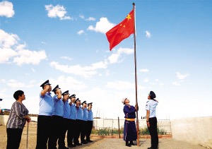 阿迪雅(右二)、妻子娜仁其其格(左一)與內(nèi)蒙古出入境邊防檢查總站包頭邊境管理支隊(duì)滿都拉邊境派出所民警在院子里升起國旗。 馮楚帆攝