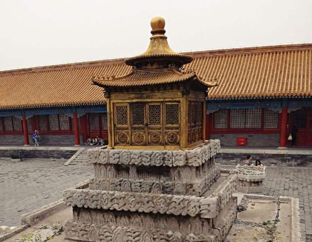 江山社稷銅亭位于故宮乾清宮丹陛兩側,東西各一座,推斷為明代永樂時期(1403-1424)鑄造。亭為銅質,上層為圓攢尖寶頂,下層為方形。銅亭安放在石質基座上,座身雕刻海水江崖圖案。
