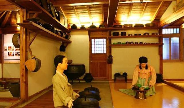 無論什么類型的朝鮮族傳統(tǒng)民居,只要走進房屋,第一個感覺就是有很大的一個炕??皇浅r族人在室內(nèi)的主要活動空間,你看有的炕上親友們在圍桌對飲,有的炕上婦女們在做活計,還有的炕上孩子們在玩耍??淮螅崦娣e就大,屋里到了冬天就會顯得特別暖和。在延邊地區(qū)朝鮮族房屋內(nèi)的灶坑更是別具一格,它下陷在地下,底部低于地面,上部還有蓋板,而蓋板和鍋臺、炕面形成了一個平面。據(jù)說,這種灶坑是既好燒、又衛(wèi)生。