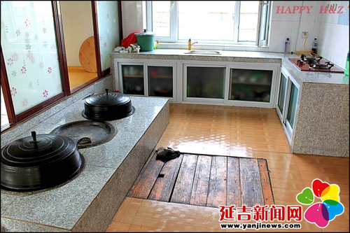 在傳統(tǒng)的朝鮮族民宅中,炕和鍋臺是平齊的,需要燒火做飯時,主婦會打開架在柜臺一側(cè)的移動木板,下到地面水平線以下的“灶坑”點火做飯。傳統(tǒng)的炕采用長筒式結(jié)構(gòu),煙火由一洞內(nèi)循環(huán)排出,使每洞都有煙火串入,炕即溫熱。朝鮮族的火坑高度為30-40厘米,但炕洞向下挖入,炕面抹白灰,表面糊油紙或鋪草簾子,炕面平整。隨著物質(zhì)條件的改善,炕面改鋪纖維板或者地板膠,既美觀又耐用。