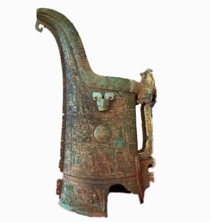 出土?xí)r,銅觥側(cè)置平放,銅壺倒置于銅觥內(nèi)。銅觥重13.45千克,器身呈扁圓形。考古專家稱,該銅觥器形獨(dú)特,如突出眼睛的變形獸面紋、“C”形扉棱、羊角騰空設(shè)計(jì)的平嘴犧首等,與以尊、罍為代表的殷墟時(shí)期南方特征青銅器相一致。