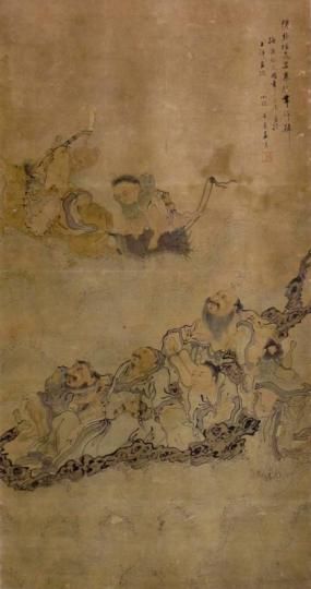 同時,展覽展出的八仙題材作品中,清代王素的《八仙圖》描繪了八仙過海的場景,八仙形象神態(tài)各異;清代蘇仁山的《李凝陽像》,則以墨筆描繪鐵拐李的背面,其身后背有斗笠和巨大的葫蘆,手持拐杖,作品構(gòu)圖獨(dú)特,線條流暢,人物形象簡拙。