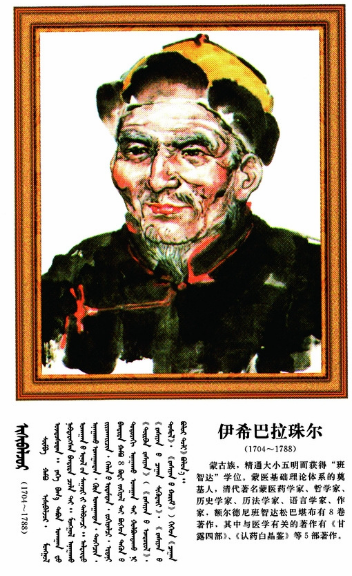 伊希巴拉珠爾(1704~1788),蒙古族,一名也協(xié)班覺、額爾德尼班智達·松巴堪布,蒙古衛(wèi)拉特人,著名蒙醫(yī)學家、文學家、天文學家哲學家。一生著作豐厚,其中對完善蒙醫(yī)理論體系有重要影響的著作有《甘露之泉》、《白露醫(yī)法從新》、《甘露點滴》、《甘露匯集》和《認藥水晶鑒》,在這些著作中他將藏醫(yī)學理論與蒙古人的體質(zhì)、生活習俗、居住地區(qū)的地理、氣候條件等具體實際結(jié)合在一起,進行創(chuàng)造性的理論研究,不僅豐富了臨床實踐的內(nèi)容,而且補充和完善了蒙醫(yī)學的理論體系,他將傳統(tǒng)蒙醫(yī)學“寒熱理論”與《四部醫(yī)典》中關于寒熱病理論的闡述進行有機結(jié)合,使之成為近代蒙醫(yī)學病性辯證的總綱,同時,他也闡述了將六基癥作為病因鑒別診斷的核心及其臨床表現(xiàn),使“六基癥”學說從理論到實踐都獲得了比較系統(tǒng)的發(fā)展。占布拉道爾吉是19世紀著名的蒙藥學家,他編著的《蒙藥正典》(又名嗚嗚蒙藥圖鑒)共收載蒙醫(yī)臨床常用藥物879種,按礦物、植物和動物等分為8部24類,附插圖576幅,對每種藥物的產(chǎn)地、形態(tài)、性味、功能、入藥部分、采集加工、炮制方法、主治、用法等都闡述詳盡,并且每一味藥物都標寫了蒙、藏、滿、漢四種文字的藥名,具有很高的參考價值。該書還附有外科術療器具圖解,以及放血穴位、針灸穴位、人體各部分劃分圖解說明等。敏如爾古布拉(1789-1838)編撰了蒙醫(yī)學方劑巨著《方?!?,是一部比較系統(tǒng)完整的蒙醫(yī)藥物方劑學經(jīng)典著作,收載方劑近200種,分為76章,進行詳盡的論述和評點,同時對相關疾病的病因、病機、分類和治法等也做了簡要論述。