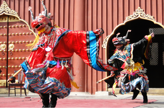 內(nèi)蒙古地區(qū)的查瑪樂舞已與藏族地區(qū)的“羌姆”明顯不同。隨著藏傳佛教傳入蒙古地區(qū)后,積極地吸收和融合了蒙古族傳統(tǒng)音樂舞蹈和薩滿教神舞的因素后形成了蒙古化的查瑪樂舞。因此,內(nèi)蒙古地區(qū)的查瑪具有復(fù)合型和多元性特點。2008年,查瑪樂舞被列入國家級非物質(zhì)文化遺產(chǎn)。