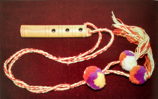 直笛,傈僳語(yǔ)稱之為“迪哩吐”(如圖),多用蘆葦制作,長(zhǎng)約5寸,有4個(gè)圓孔,3孔在正面,1孔在背面,音量較小,音色柔和動(dòng)聽,為青年男女抒情和求愛必要的工具。