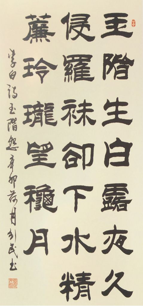 張行民的書法作品博覽眾家之長,悉心揣摩隸書之要義,領(lǐng)悟其精髓,加入其心志與感悟,漸漸形成了自己的風格。他的作品灑脫飄逸,體骨厚重,參合有各派書體的筆意,同時又有自己個性和意境的張揚,字體端莊英武,體象收放凝度。賞其書法,總能給我們一種“渾然陣列,筋道玉骨”的美感,實屬不可多得。