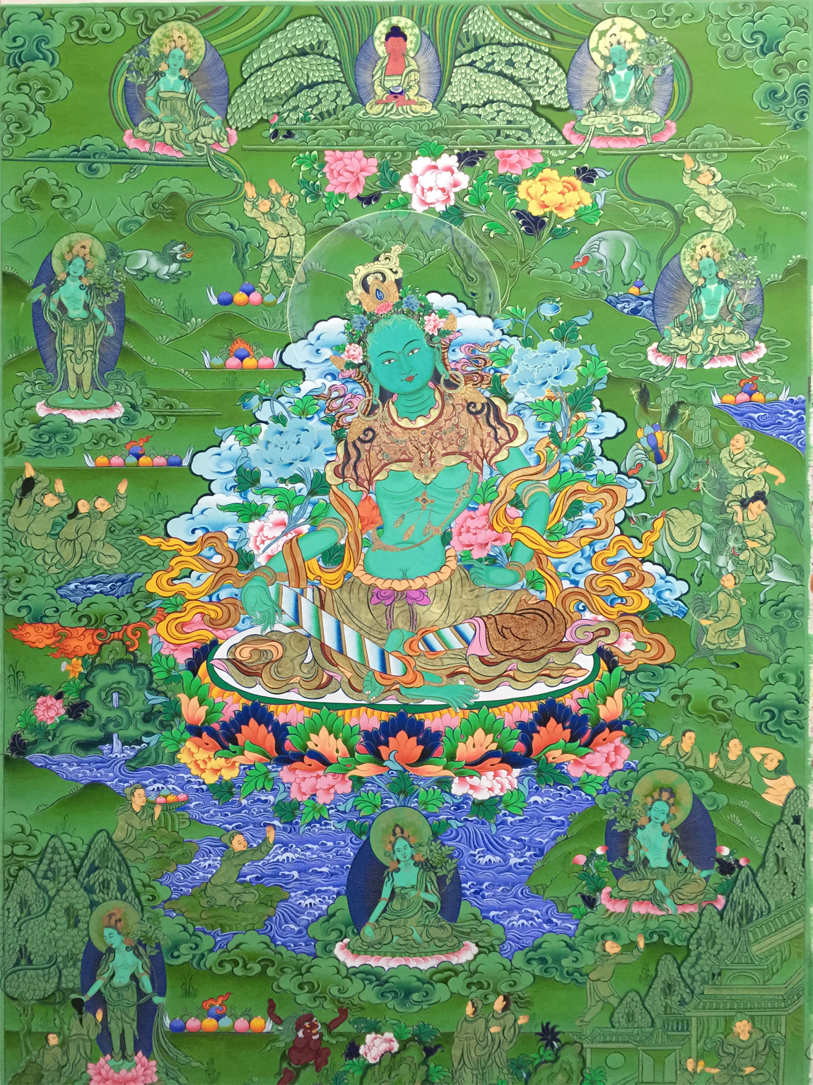綠度母即觀世音菩薩之化身,為二十一度母之主尊,持通本尊咒,能總持二十一度母之功德。修持此尊密法,能斷生死輪回,消除一切魔障、業(yè)障,并能消災(zāi)增福,延壽廣開智能,凡有所求無不如愿成就,且命終往生極東世界。唐朝的文成公主咸信是綠良母的化身。