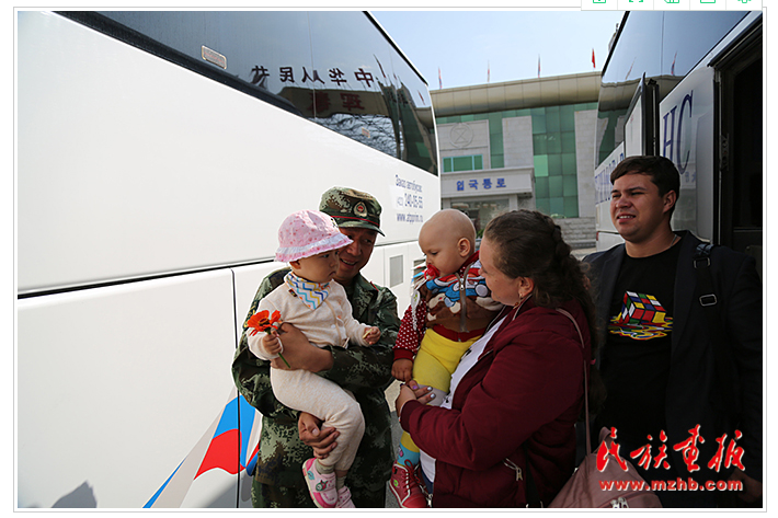 第一次來琿春旅游的俄羅斯游客亞娜帶著她1歲的寶寶剛?cè)刖常∏捎龅綆Ш⒆映鰜淼闹袊叿缿?zhàn)士,他們便打起了招呼
