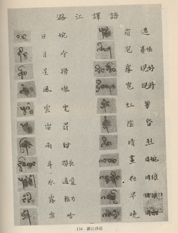 清代華夷譯語之一種,為云南潞江一帶當(dāng)時(shí)流行的傣文。此為原件之修補(bǔ)本。橫寬23厘米,高30厘米,共31頁。這種文字形體以傣哪文為基干,又帶有傣繃文的書寫特點(diǎn)。此修補(bǔ)本現(xiàn)存中央民族學(xué)院圖書館。
