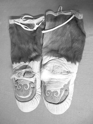 現(xiàn)收藏于民族文化宮博物館的這副狍皮手套,是鄂倫春族冬季狩獵時(shí)必備的傳統(tǒng)服飾之一。該手套拇指與四指分開,四指部分連成一體。手套通長48厘米、寬13厘米,套口處穿有一根可收縮的白色帶子。手腕處到套口是外翻毛皮,長21厘米。手心外翻皮毛長近5厘米,拇指和掌邊及四指前部用染色小塊獸皮剪裁成云卷蝴蝶紋進(jìn)行補(bǔ)繡,紅、綠線縫皮邊,云紋中間有一棱形藍(lán)色布裝飾。該手套選料精良、樣式古樸,是狍皮手套的精品,體現(xiàn)了鄂倫春族獨(dú)一無二的游獵文化。