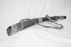 這只紅松木質(zhì)地的鹿哨呈牛角形,中間鏤空,以細(xì)鱗魚皮熬膠粘合,頭部細(xì),尾部粗,呈喇叭狀;在頭、尾、中間箍三道箍,在接近頭尾的兩端纏細(xì)皮繩為環(huán),環(huán)上系寬皮帶,便于出獵時(shí)背挎于肩或平時(shí)懸掛。它在現(xiàn)存同類器物中制作時(shí)間較早,源流、傳承清晰。在它質(zhì)樸的外表下,集中體現(xiàn)了北方狩獵民族的生活經(jīng)驗(yàn)、創(chuàng)造智慧以及審美觀念。