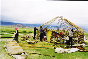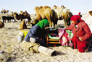 每戶人家的家就在那三四頭駱駝的背上,駱駝的先后排列也是有講究的。一般第一峰駱駝負(fù)責(zé)運(yùn)被褥,婦女和小孩也坐第一峰駱駝。后面的駱駝則運(yùn)衣服、日用品、食物、氈房的羊毛氈和氈房骨架。家里的男人們則騎著馬,趕著大群的牛羊緊跟在后面。平時(shí)來往較少的牧民們因?yàn)檗D(zhuǎn)場,有了歡聚的機(jī)會(huì)。每天下午,牧民們就開始在路上安營扎寨,男人們開始從駝背上卸下氈房,在路邊搭建臨時(shí)簡易氈房;女人們生火煮飯,孩子們成群地奔跑嬉鬧,每家的牧羊狗或打架或形影不離。緩緩的炊煙在金色的黃昏中飄散,男人們開始圍在篝火旁喝酒唱歌,火光映紅每一張黝黑的臉龐,悠遠(yuǎn)的歌聲在空曠的夜空飄蕩。