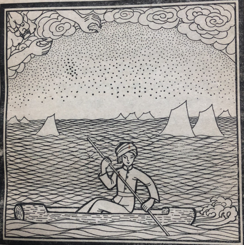 厄霞看見札努札別依然沒有餓死,又想出了一條毒計(jì):他把天河上的水放下來,整個大地變成白茫茫一片汪洋大海。跑到高山去的人僥幸沒有淹死。住在平地上的人,都被洪水淹死了,厄霞以為這一次札努札別也一定淹死了。但當(dāng)厄霞來看時,札努札別坐在掏空了的木槽里漂在水面上,依然沒有淹死。于是,原來不知道造船的人們,從這次起,后世便知道造船了。