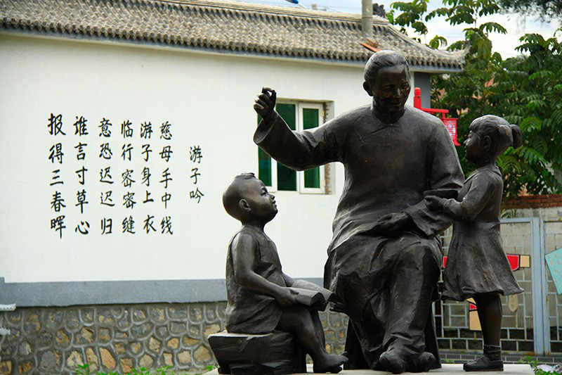 村子的胡同干凈整潔,精心設(shè)計的院墻上分別繪制著中國古代《二十四孝圖》浮雕、新編《二十四孝圖》彩繪圖、國學(xué)名言名句磚雕以及各種助人為樂兒童圖畫。