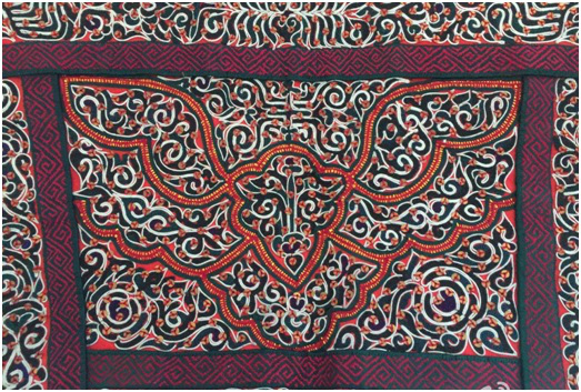而在背兒帶下部的中心圖案則是一個古老的傳統(tǒng)紋樣。主體形象以同心圓為主,里面的幾何裝飾圖案依次向外擴散,就像太陽的光芒一樣向四周散射。圓是一個太陽,里面有一棵樹,即小孩的生命樹,寓意生命之樹長青,樹上有一顆石榴花,寓意多子。太陽周圍彩帶狀紋樣代表雷鳴與閃電。雷神的地位在水族社會中是至高無上的,能主持正義、懲惡揚善。背兒帶上繡雷鳴便是祈求雷神對幼兒的庇佑。太陽紋與雷神的象征圖案組合,是水族自然神崇拜信仰的寫照。太陽圖案上下繡有兩只大蝴蝶,左右各繡一只老鷹。下部的四角是葫蘆紋,葫蘆的形象源于水族的創(chuàng)世神話。天地初始之時洪水泛濫,作為水族先人的兄妹二人為了躲避洪水,棲身于一支大葫蘆中,直至洪水退去。兄妹二人走出葫蘆,結(jié)為夫妻,繁衍生息,才有了今日成千上萬的水族兒女。于是,葫蘆被賦予了繁衍、生殖的意義。