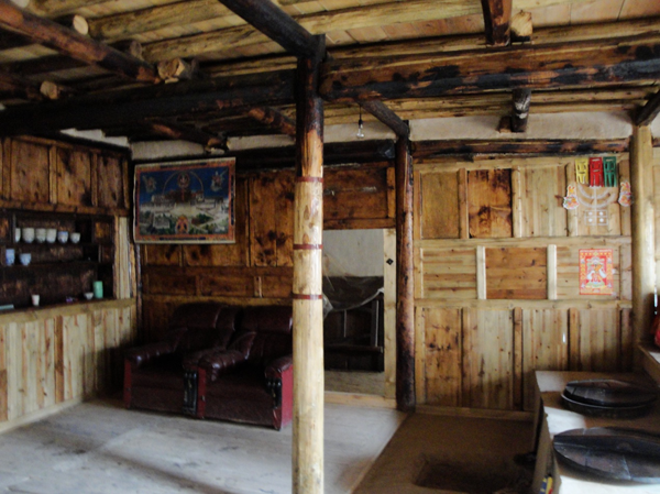 為改善狹小的寨內(nèi)空間,當(dāng)?shù)鼐用窬藿硕幽窘Y(jié)構(gòu)樓房,和青海鄉(xiāng)村民居庭院寬敞的特點(diǎn)形成了反差。寨內(nèi)民居庭院多為四合院式,房屋為土木結(jié)構(gòu)平頂房,一般民居都有飛椽花藻之類(lèi)。屋內(nèi)一般以木板作隔扇,室內(nèi)有護(hù)炕木板、護(hù)墻木板墻圍,且多雕花草于其上。房屋一般面闊三間,正面以木板隔墻并裝上木板條方格小花窗。佛堂設(shè)在二樓,佛堂所在的房屋一般都是上房,和佛堂不同向的兩邊廂房一般做臥室。院落中央一般都有豎掛經(jīng)幡的旗桿,還設(shè)有桑臺(tái),具有明顯的藏式特點(diǎn)。