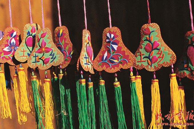土族盤繡為當(dāng)?shù)貗D女帶來(lái)了不少經(jīng)濟(jì)收入。圖為線條流暢、層次豐富、撞色奔放、針腳細(xì)膩的土族盤繡荷包(祁春英 攝影)