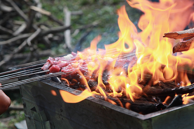 負(fù)責(zé)燒烤者將串好的肉串在水里蘸一下,再往長(zhǎng)形的白鐵皮烤串爐上一放,“刺啦刺啦”的油脂滴在炭火上,白氣與火苗齊竄,再往肉串上灑孜然、辣椒、鹽,一股藍(lán)色的香氣噴涌而出,撩撥著人們的味蕾??救庹邇墒纸惶娣D(zhuǎn),依經(jīng)驗(yàn)把握時(shí)間及火候,出爐前再均勻?yàn)⑸弦槐檎{(diào)料,這一大把烤肉就出爐了。