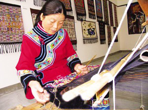 在鳳凰小城的晨曦中,東正街“水云”織錦坊里,貨架上幾乎看不到什么織錦物品,卻總有顧客慕名前來求購?!敖?jīng)常是剛織好的織錦,一下織機就直接寄給了訂貨商?!闭f話的人就是葉水云,“土家織錦不用針,完全是用手挑出來的,所以出活特別慢,一天也就能織六七厘米,1米見方的一塊要織半個月?!痹诋?shù)兀芸棥拔魈m卡普”的女子已經(jīng)屈指可數(shù)。上世紀80年代中期,湘西大約有2000人從事土家織錦,現(xiàn)在大概還不足200人,招工很難。葉水云家的“活兒”被公認為做得最漂亮的,市場自然是供不應求,“水云織錦坊”早已名聲在外。