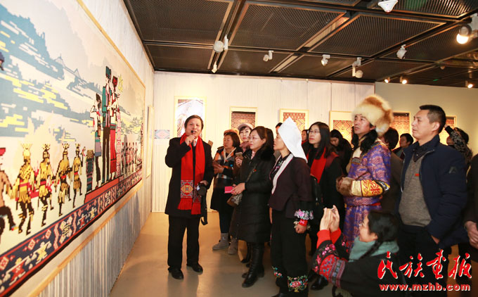 會上中國民族博物館黨委副書記、副館長張志文向少數(shù)民族作家們介紹了展覽,他說:“土家族是一個歷史悠久的民族,現(xiàn)在有835萬人口。土家織錦也有兩千多年的發(fā)展歷史,有250多種傳統(tǒng)圖案,是中國民間五大織錦之一,堪稱中國服飾文化中的奇葩。中國民族博物館從歷年征集收藏的300多幅清代以來的土家織錦中,選取了156幅精品土家織錦、21分鐘傳承人視頻和120余幅土家民族風情照片。我們和中國婦女兒童博物館合作舉辦了這個高品質(zhì)的專題展,旨在傳承和弘揚土家族國家級非物質(zhì)文化遺產(chǎn)?!?/p>