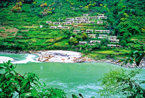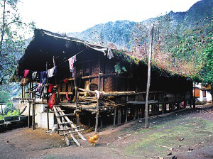在怒江上游峽谷聚居的傈僳村寨都建在高山的半山上,其民居俗稱為“千腳落地房”。說“千腳落地”雖有些夸張,但也足以形象地說明峽谷溫?zé)岬臍夂蚝蜕礁咂露傅牡乩項(xiàng)l件。在雨季時(shí),“千腳”阻力最小,使山洪順利傾瀉而下,又很快干爽,免受潮氣。而且不需挖地動(dòng)土,不必移石砌墻,對(duì)木料沒有過高要求,長(zhǎng)短皆用,在生態(tài)脆弱的高山峽谷也算環(huán)保建筑。“千腳落地”是因建房時(shí)先在確定的屋基上依斜坡程度和住房面積打進(jìn)數(shù)十根到百余根木樁為基樁,以保證居室樓板的平正?;鶚洞蚝煤螅拿媪魩赘咧鳛檎麄€(gè)房屋的立柱外,在密集木樁所形成的平面上滿鋪竹篾編織的樓板,還有竹篾圍墻,所有結(jié)構(gòu)皆用竹篾綁扎。屋頂鋪苫草或蓋木片瓦,近幾年,已陸續(xù)換上了大塊的水泥波形瓦。房門開在山墻一側(cè),有廊道,可做曬臺(tái),平時(shí)穿的衣服都搭在這兒,也是婦女做針線活的地方。隨著怒江峽谷的開發(fā)和新農(nóng)村建設(shè)的深入,通路的村寨將很快會(huì)改變面貌。