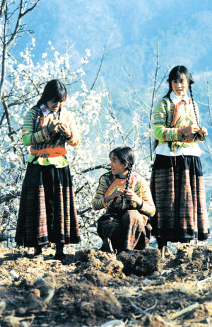 梳頭比賽結束后,參賽的傈家女才把發(fā)辮盤于頭上,包上傳統(tǒng)的頭帕,然后開始在寨子里織布刺繡了。