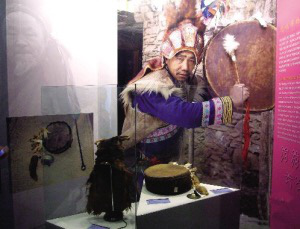 在民族文化宮的展覽中,有一幅大照片——一位老釋比,手拿羊皮鼓,頭戴猴皮帽,表情莊嚴、凝重。那正是釋比傳人朱金龍。朱金龍這次也來到了北京,把他祖祖輩輩傳下來的釋比文化展現(xiàn)給北京的觀眾。