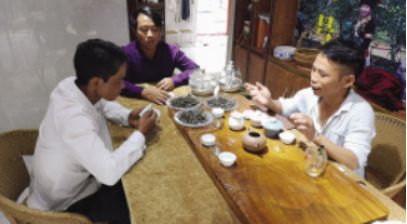 巖少忠(右一)和村民“斗茶”。郭家翔攝