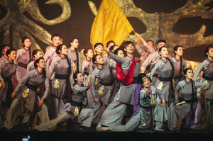 《遙遠的察布查爾》以沈陽錫伯族同胞西遷新疆屯墾戍邊的史實為創(chuàng)作素材,融合了音樂、歌劇、舞蹈、雜技等多種藝術(shù)形式。全劇分為五大篇章。第一章《家鄉(xiāng)如天堂》,描繪了錫伯族在廣袤的呼倫貝爾大草原、豐饒的遼東大地建設(shè)自己的家園,他們狩獵、捕魚、耕作的生活景象;第二章《奉詔別鄉(xiāng)》,講述了錫伯族官兵奉清廷之命前往遙遠的伊犁戍邊駐防,族人們用特有的薩滿爬刀梯的形式祈禱,祝福遠行的親人一路平安;第三章《大西遷》,展現(xiàn)了艱辛的西遷路程;第四章《戈壁開大渠》,表現(xiàn)了堅強的錫伯族人面對惡劣的自然環(huán)境,開掘大渠,引來滾流不息的生命之水;第五章《戍邊屯墾再創(chuàng)天堂》,講述了新疆錫伯族人不但在金戈鐵馬的歲月中保存了自己的文化,還將滿語、滿文完好地傳承至今,創(chuàng)造了一個個人間奇跡。