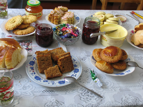 俄羅斯族人的主食主要是自己烤制的列巴(一種較硬的面包)和煎餅,副食有肉、雞蛋、灌腸、牛奶、黃油等,他們喜歡吃俄式夾餡面包和無餡面包及各種糕點(diǎn),喜歡吃烤鵝、烤牛肉片、牛肉煮土豆、雞蛋腌豬肉片等俄式熱菜,喜歡吃黃瓜、西紅柿、土豆、胡蘿卜、圓白菜等蔬菜。愛喝加有牛肉和土豆的各種菜蘇波湯、白酒(伏特加)和自己釀制的醇香甜美的啤酒。他們的日常飯菜主要有俄羅斯風(fēng)味的黑列巴、布拉其尕、魯列特、古力其、比羅哥、蘇波、尕德列得、土豆燒牛肉、比羅什給、布里內(nèi)、阿拉嘰等。