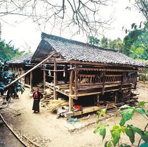 樓上住人、煮飯、貯藏糧食,樓下圈養(yǎng)牲畜。以簡(jiǎn)易板梯上下,有小廊道。室內(nèi)順梁開(kāi)前后兩道門,中間的通道將屋內(nèi)分成兩部分。右側(cè)為客房,設(shè)火塘,供佛像;左側(cè)為家人臥房,以竹篾隨意分隔,無(wú)門,只擋一布簾,通風(fēng)透光。正門一邊搭曬臺(tái),用來(lái)曬糧、曬衣服和洗漱。住房一側(cè)多建有附房,用以堆柴、舂米、放置生產(chǎn)工具和雜物。