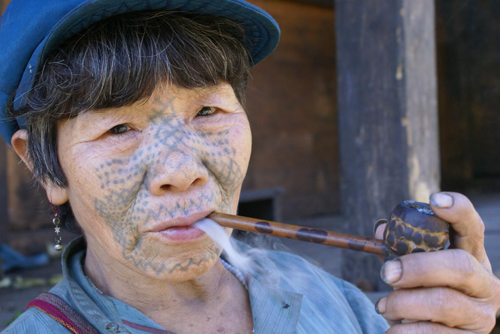 至于紋面原因,紋面女們有多種說法,有的說是為了好看,有的說是為了死后與靈魂相認,有的說是為了不被人搶去為奴,有的說是為分辨男女。有的為了死后能帶走生前的東西。紋面是一件極痛苦的事,一般是用一根荊棘刺出圖案,用西南樺制成的染料著色。臉上血管、神經(jīng)豐富,要紅腫、劇痛3-5天,所紋圖案終生不退。
