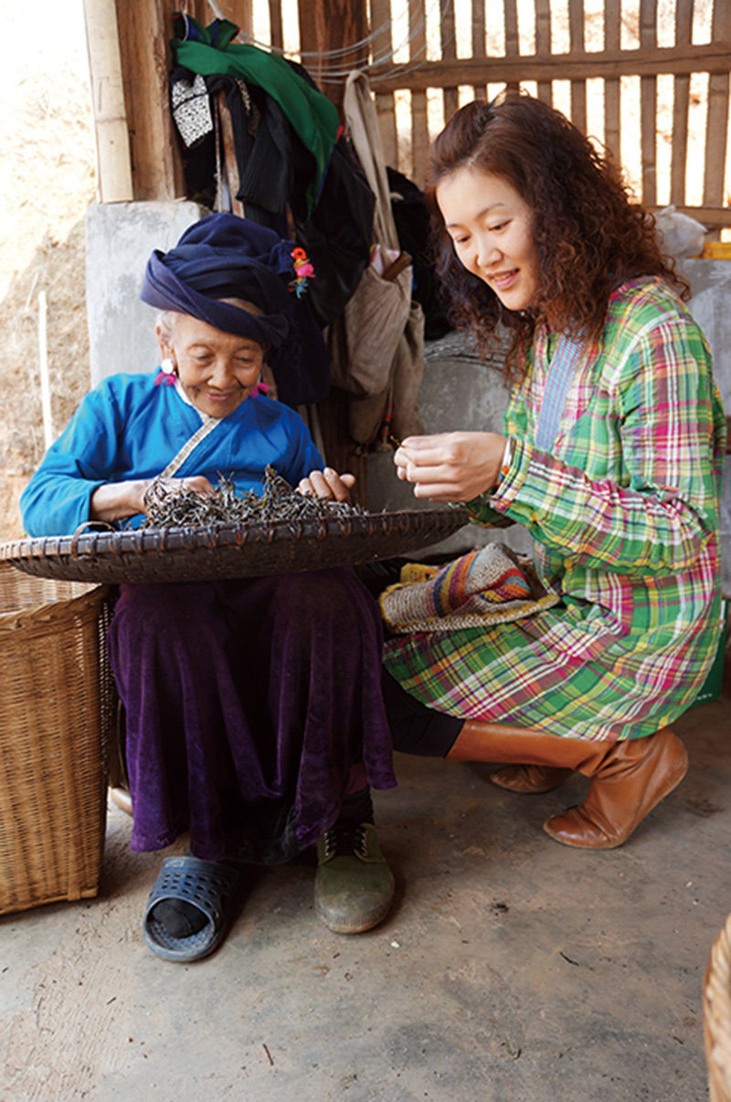 殺青完畢,接下來是手工揉捻。揉捻相較殺青要輕松得多,經(jīng)過處理的茶已開始轉(zhuǎn)化,散發(fā)出清新的香氣。此時(shí)萍芳終于可以坐下來,為自己和我們泡上新鮮的茶。