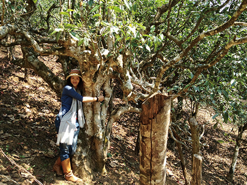 又走了一段,老茶樹開始出現(xiàn)在路邊。老茶樹主干與人的大腿等粗,萍芳家70年茶園茶樹主干也就手臂粗,長成大腿粗恐怕要好幾百年吧?茶樹上還另架著一根木頭以供上樹,我與唐郎興奮地爬上去假裝采茶,環(huán)顧四周滿滿的枝葉,原來站在古茶樹上這么威風(fēng)啊!