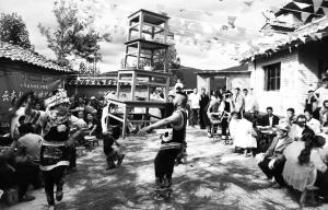 輪到阿文光跳抬菜舞了,只見他穿一件繡滿山茶花的彝族火草領(lǐng)褂,亮晃晃的光頭,微微挺起的肚子敞露著,嘴叼一張八仙桌,桌上擺了“八大碗”。他右手三指托盤,左手搭塊新毛巾,面帶笑容,摔手踢腳,搖頭晃腦,似醉非醉,動(dòng)作十分驚險(xiǎn),真讓人擔(dān)心一桌子菜會(huì)掉下來。旁人告訴我,這就是望天坡抬菜舞中的絕活,最精彩的“口功送菜”。嘴是用來控制方向的,重量其實(shí)通過八仙桌的腿大部分落在肚子上了。
