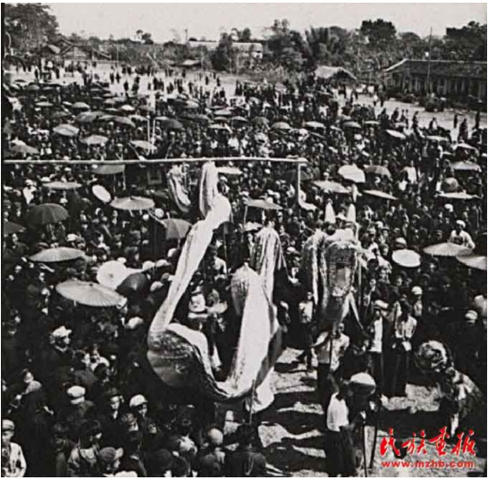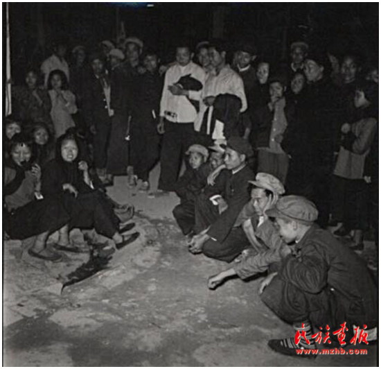 “歌圩”是桂西壯族古老的風俗。每年農(nóng)歷正月、二月、四月都有歌圩日。圖為1957年廣西壯族自治區(qū)憑祥市郊區(qū)的歌圩日,這里不但處處歡歌笑語,還有搶花炮、演壯戲、舞彩龍、舞彩鳳、唱桂劇等很豐富的文娛活動