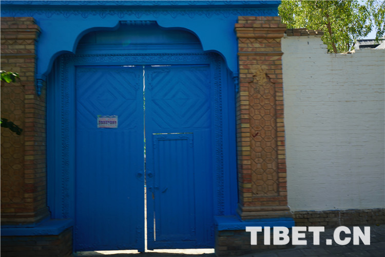 目前,喀贊其仍保留著一定數(shù)量的文物古跡,包括自治區(qū)級文物保護(hù)單位1個(gè)(陜西回族大寺),市級文物保護(hù)單位7個(gè),另有12處清真寺建筑。圖為具有當(dāng)?shù)靥厣呐R街藍(lán)色大門。