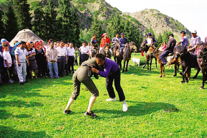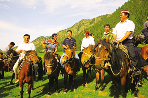 座談會結(jié)束后,大家又來到新地溝草原,舉行哈薩克族民間傳統(tǒng)體育活動,哈薩克族群眾紛紛參加姑娘追、摔跤、叼羊、賽馬等活動。一時間人聲鼎沸,歡歌笑語,草原上呈現(xiàn)出一片歡悅的景象。