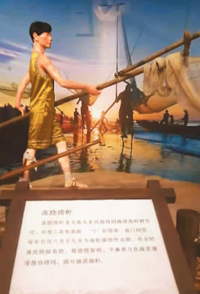 廣西東興市京族文化傳承與保護(hù)中心展出的京族捕撈傳統(tǒng)——高蹺撈蝦,也就是現(xiàn)在學(xué)生們學(xué)習(xí)的高腳罾。記者 龐革平攝