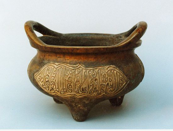 侈口、方唇、窄卷沿、矮束頸、扁鼓腹,口沿立一對橋形耳,底部以矮小的三乳足支撐整個爐身。外腹壁兩大兩小四組開光內(nèi)均以珍珠紋為底,陽刻有阿拉伯文字,漢譯為:“最貴的記主詞(吉克爾)是念清真言(萬物非主,唯有真主,穆罕默德是真主的使者)”,底款漢文四字篆書“宣德年制”。阿拉伯文構(gòu)成此爐的主體紋飾,圖案別致,內(nèi)涵深奧,寓意獨特,雕刻手法精細、嫻熟,線條婉轉(zhuǎn)流暢,自然雅致,具有韻律之美。該器物銅質(zhì)精良,造型優(yōu)美,工藝考究,將冶鑄、雕刻技術(shù)與阿拉伯文書法絕妙融合,堪稱回族文物中的珍品。