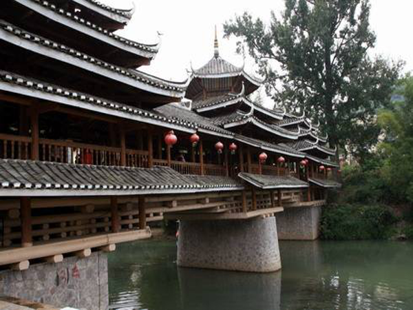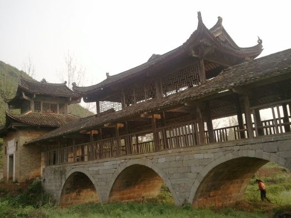 瑤族風(fēng)雨橋,又被稱之為“涼橋”或“風(fēng)水橋”。除木橋外,大多是在石拱橋上加蓋橋廊、橋亭和在橋頭的橋臺(tái)上建閣樓,穿斗式木構(gòu)架,二層檐或三層檐,有的四層檐,通高在9米~10米間。風(fēng)雨橋不僅是路人避雨之處,也是瑤族男女青年談情說(shuō)愛(ài)的約會(huì)場(chǎng)所。廣西瑤族風(fēng)雨橋主要集中在富川瑤族自治縣和恭城瑤族自治縣。富川縣保存至今的古代瑤族風(fēng)雨橋有18座,其中著名的有迥瀾橋(建于明萬(wàn)歷年間),青龍橋(與前者同時(shí)期修建),以及福壽橋、高橋、鳳溪新橋、皇侯泉橋、東轅橋、鸕鶿塘瀾通橋、龍歸橋、興隆橋等。