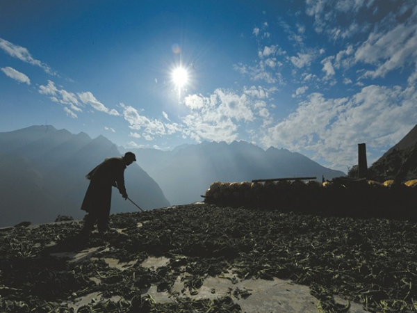 夕陽西下,陽光從山的后面投射出光束,一只老鷹在山谷上空順著風(fēng)勢盤旋。楊慶平又開始將晾曬的煙葉慢慢收攏?!叭死狭?,我是不會離開寨子了,也離不開了?!睏顟c平說他會一直守護(hù)著祖屋,守護(hù)著寨子。