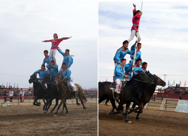 蒙古族的馬術(shù)表演非常精彩,有很多項(xiàng)目。“跨越障礙”是在運(yùn)動場跑道上每隔幾十米設(shè)置一個高1米的跨欄。跑道終端立著一個直徑約2米的火圈,矯健的坐騎從起跑線踏蹄起跑,越過跨欄,鉆過火圈直達(dá)終點(diǎn)?!俺笋R斬劈”是在200-250米的距離之間樹起十幾個目標(biāo)。騎手們手持馬刀,疾馳如飛,經(jīng)過一個個目標(biāo)時舉刀劈砍,刀起標(biāo)落?!榜R上技巧”是由運(yùn)動員們在飛馳的馬背上做出各種造型動作。運(yùn)動員一般八九歲就要在馬術(shù)隊(duì)接受嚴(yán)格的訓(xùn)練。技巧表演可分單項(xiàng)和多項(xiàng),其中又包括單人單馬、單人雙馬、雙人雙馬和多人多馬。一匹飛奔的馬經(jīng)過騎手身邊,騎手可以突然抓住馬鬃翻身上馬,又會突然下馬腳尖點(diǎn)地再躍上馬背。其他技巧還有在馬背上“空翻倒立”“側(cè)方隱蔽”“樓里藏身”以及驚險(xiǎn)的“馬上疊羅漢”等表演【如圖,劉軍攝影,編者修剪合成兩圖】。