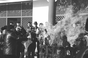 在主祭者的帶領(lǐng)下,男人們排隊(duì)走到火壇旁,一邊把自己帶來(lái)的白酒、黃油、羊肉等物恭敬地拋入火中,一邊禱告。按照傳統(tǒng),女人們?cè)谒谐绦蚨几嬉欢温鋾r(shí),最后走到火壇邊祭拜火神,祈福新春。