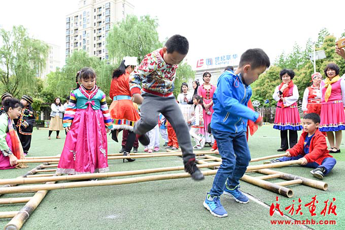 每次活動(dòng)日,學(xué)校都會(huì)從民族傳統(tǒng)游戲中梳理出十多個(gè)符合幼兒年齡特點(diǎn)、有助于幼兒身心發(fā)展的游戲內(nèi)容,因地制宜轉(zhuǎn)化成有趣的幼兒民間運(yùn)動(dòng)游戲。在游戲中,既讓孩子們體驗(yàn)了運(yùn)動(dòng)樂趣,又傳播了民族知識(shí)。這些富有童趣的游戲,深受孩子們喜愛。